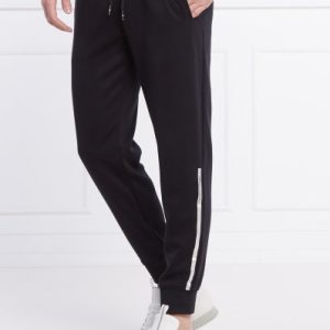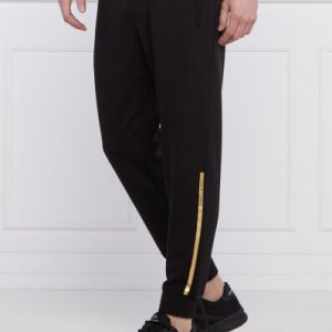 Details and logo lettering with a metallic effect finish embellish the sports trousers in stretch fabric. The model with elastic and drawstring at the waist, has side pockets and ribbed elastic bottom.