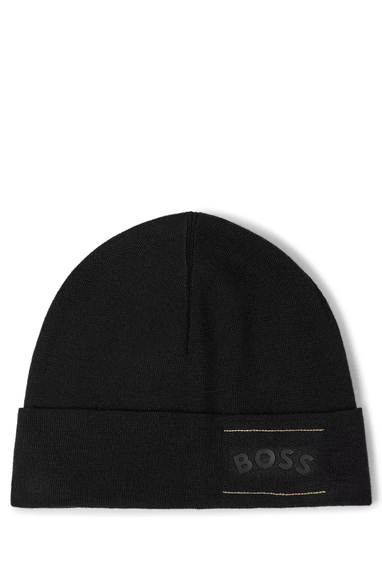 A contemporary beanie hat by BOSS. Created in soft yarns blended with virgin wool for a cosy feel, this beanie hat is detailed with a curved BOSS logo and chain-stitch trims. Add the coordinating scarf for a winter-ready look.