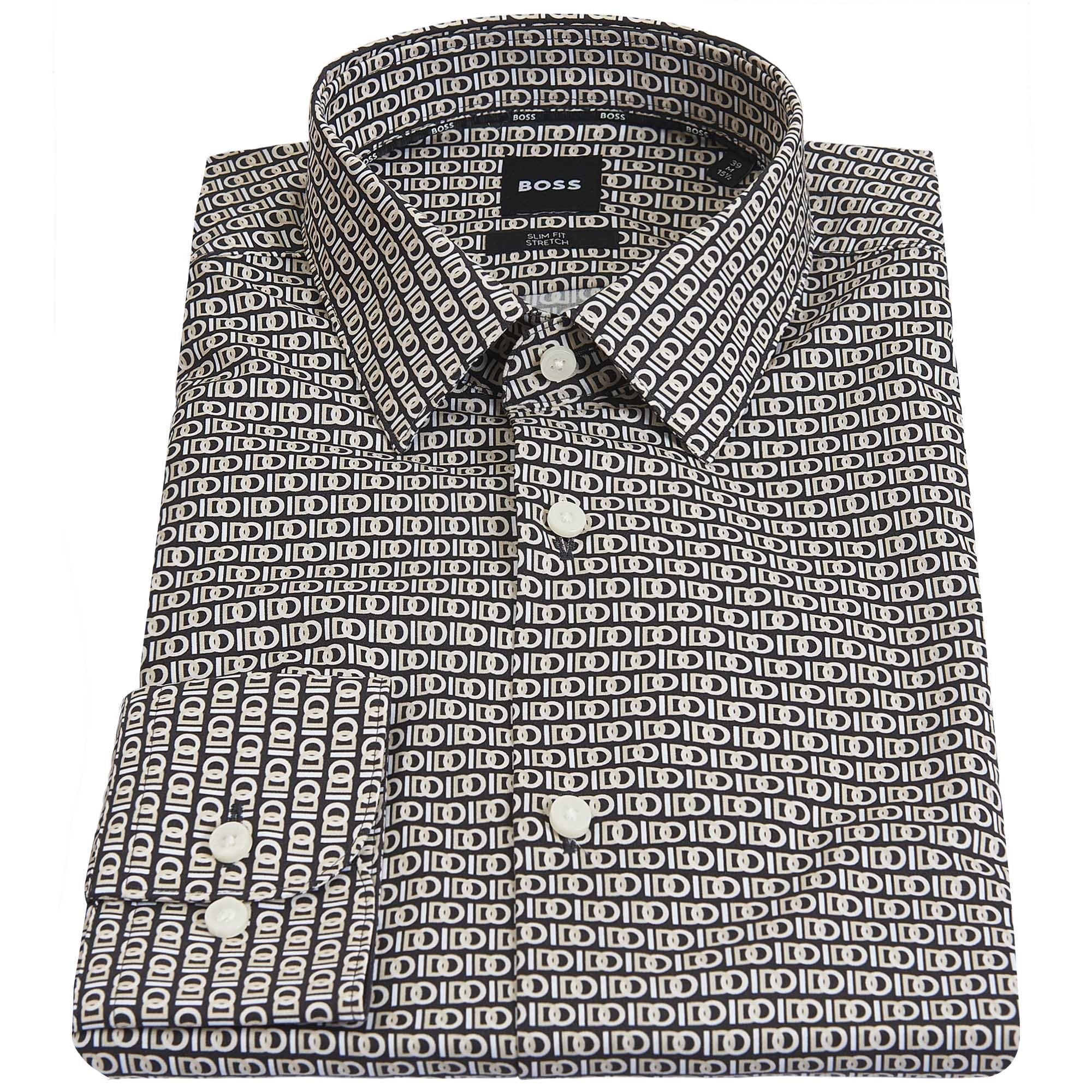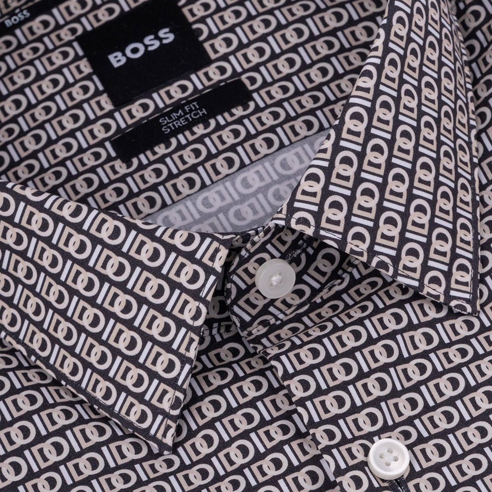 Men’s shirt from the BOSS collection by Hugo Boss. It has a Kent collar and is decorated with an all-over print design in different tonal shades, creating an original yet elegant ensemble. Made of elastic cotton fabric, in a slim fit.