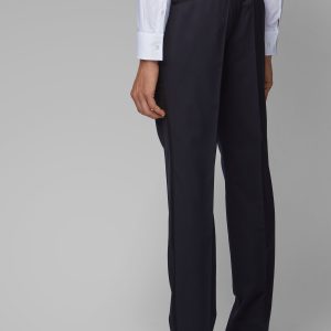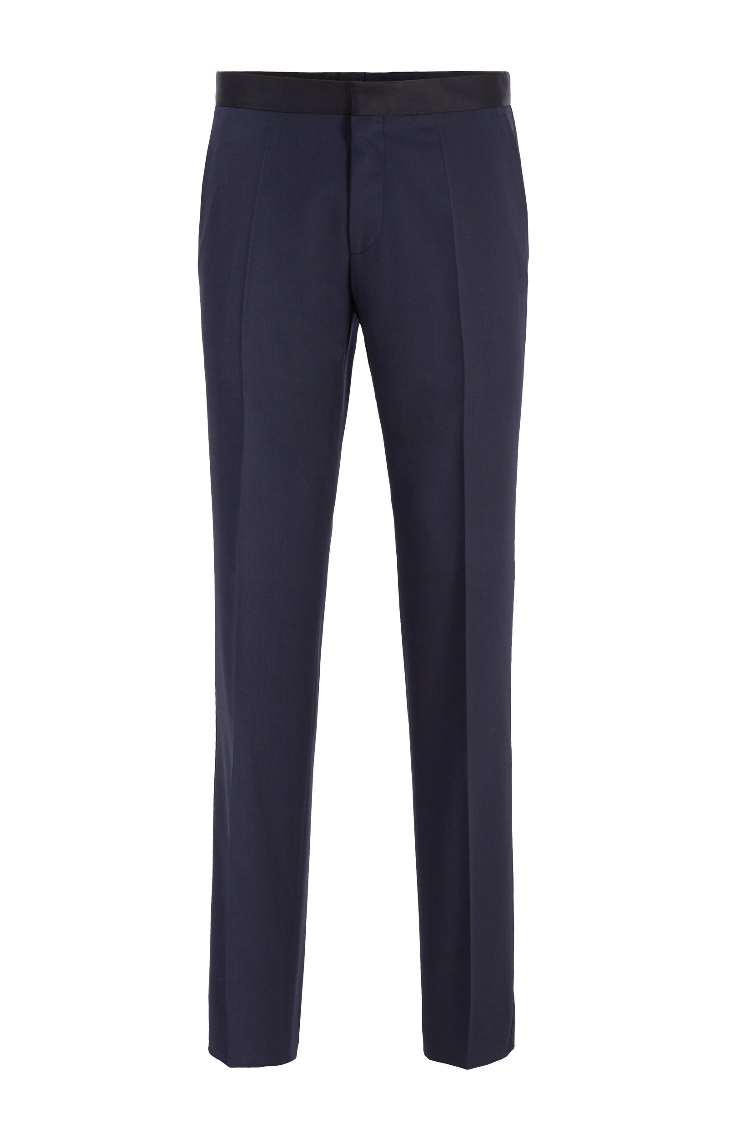 An elegant suit separate in rich yarn-dyed virgin wool as part of the Create Your Look range by BOSS Menswear. Trimmed with refined accents in silk, these narrow-cut formal pants feature a zipper fly, cotton pocketing and side slash pockets. Pair with the coordinating jacket for distinctive evening style. The Create Your Look collection allows you to combine different sizes and fits to build a suit that perfectly matches your body type, offering freedom of movement, maximum comfort and versatile style.