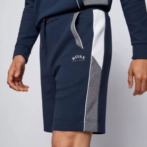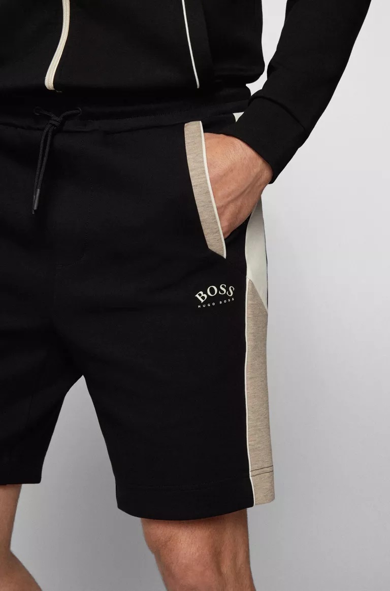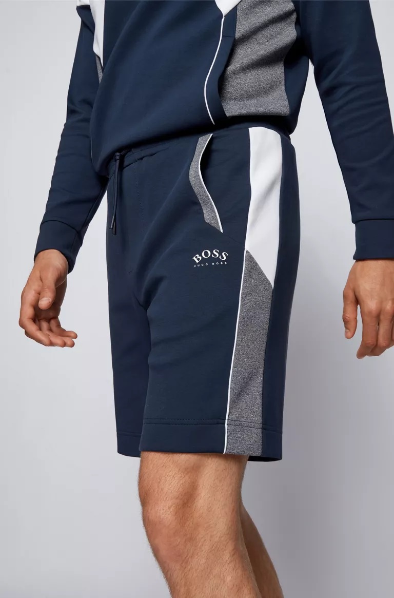 Regular-fit shorts by BOSS Menswear. Created in cotton-rich jersey with stretch, these shorts are styled with a curved BOSS logo and sporty color-blocking. This pair is finished with two-tone binding for typical attention to detail.
