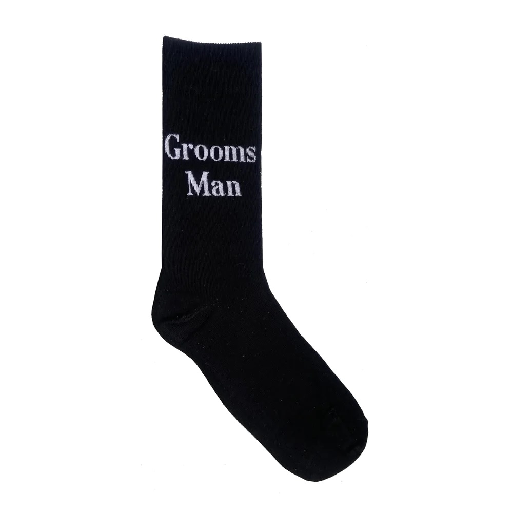 Black cotton socks with ‘Grooms Man’ in white.Â