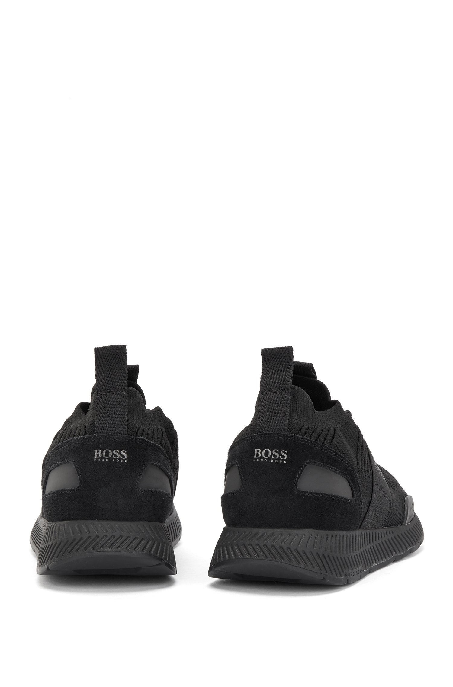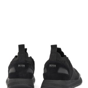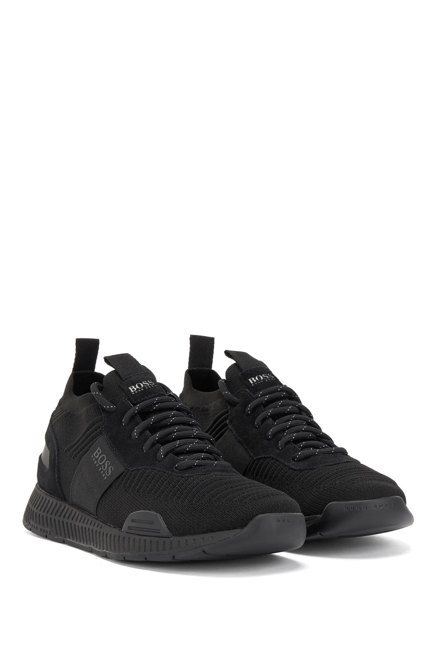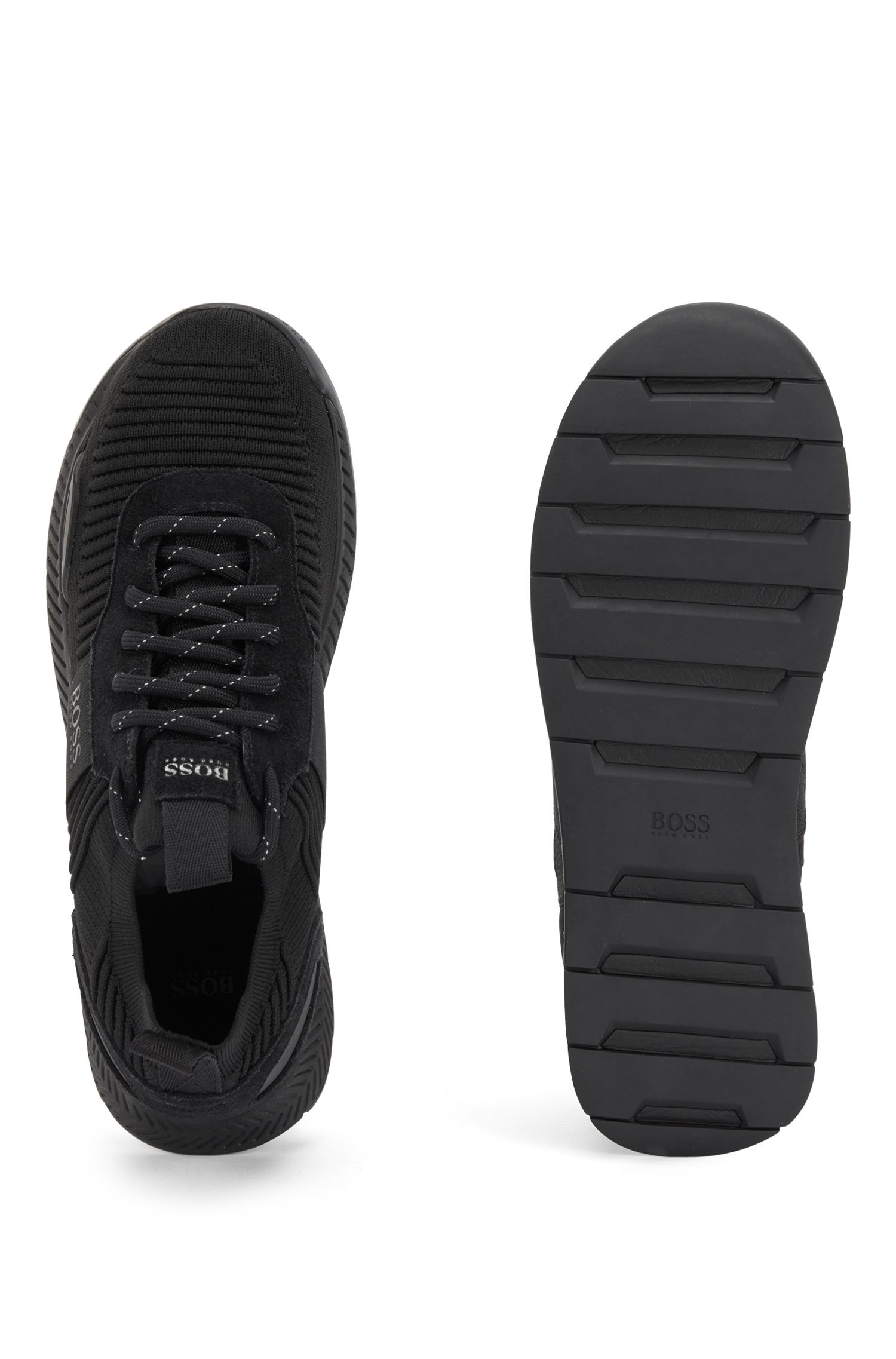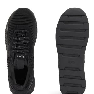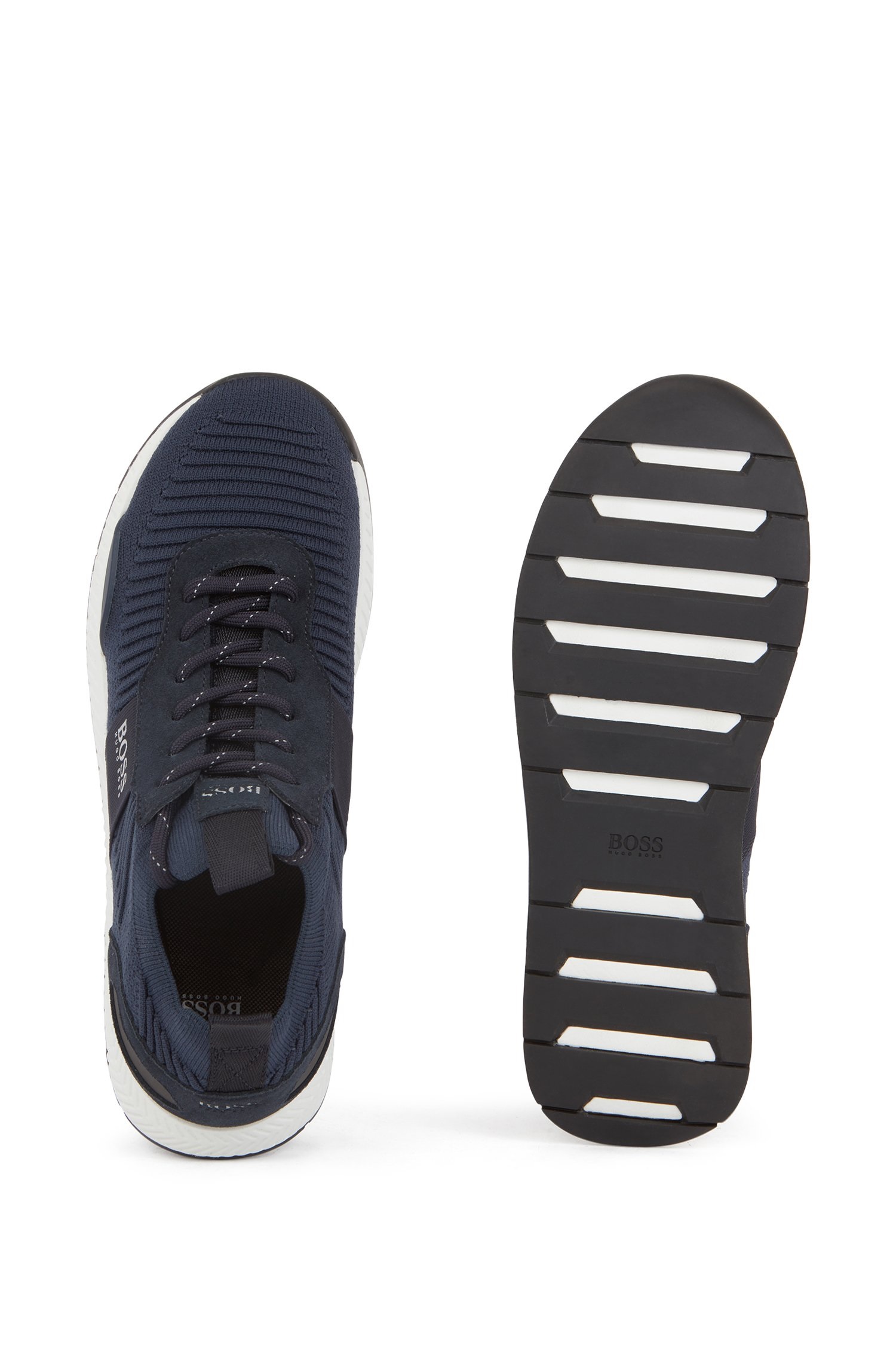 Contemporary trainers by BOSS, trimmed with webbing details and an EVA outsole. These lace-up trainers feature a knitted sock crafted in structured REPREVE® yarns, which are derived from plastic bottles that would otherwise end up in the ocean. BOSS logos add signature attitude to this more eco-friendly pair, created as we continuously look for more responsible ways to produce and finish our products.