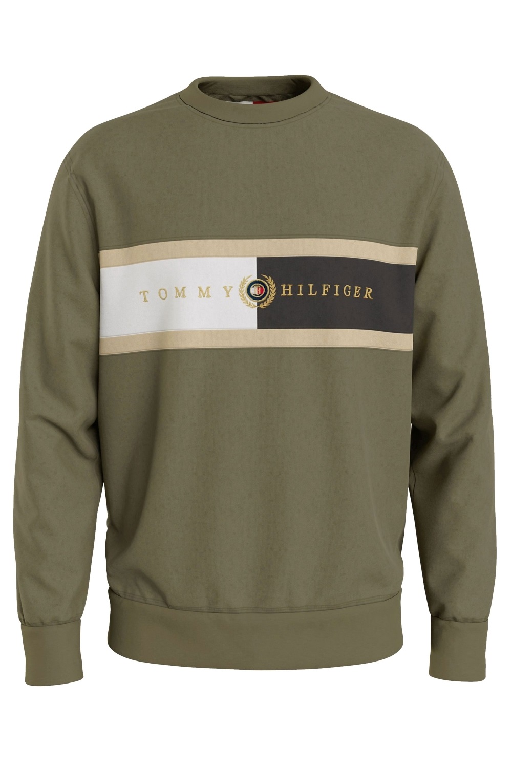 Elevate your casualwear collection with this sweatshirt by Tommy Hilfiger. In a khaki colourway, it is a classic style that features a bold, golden Tommy Hilfiger logo embroidered at the chest. Pair with jeans for a casual look or sweatpants for ultimate comfort.