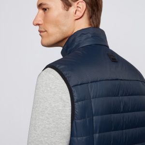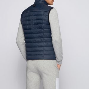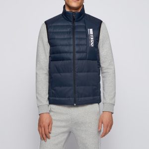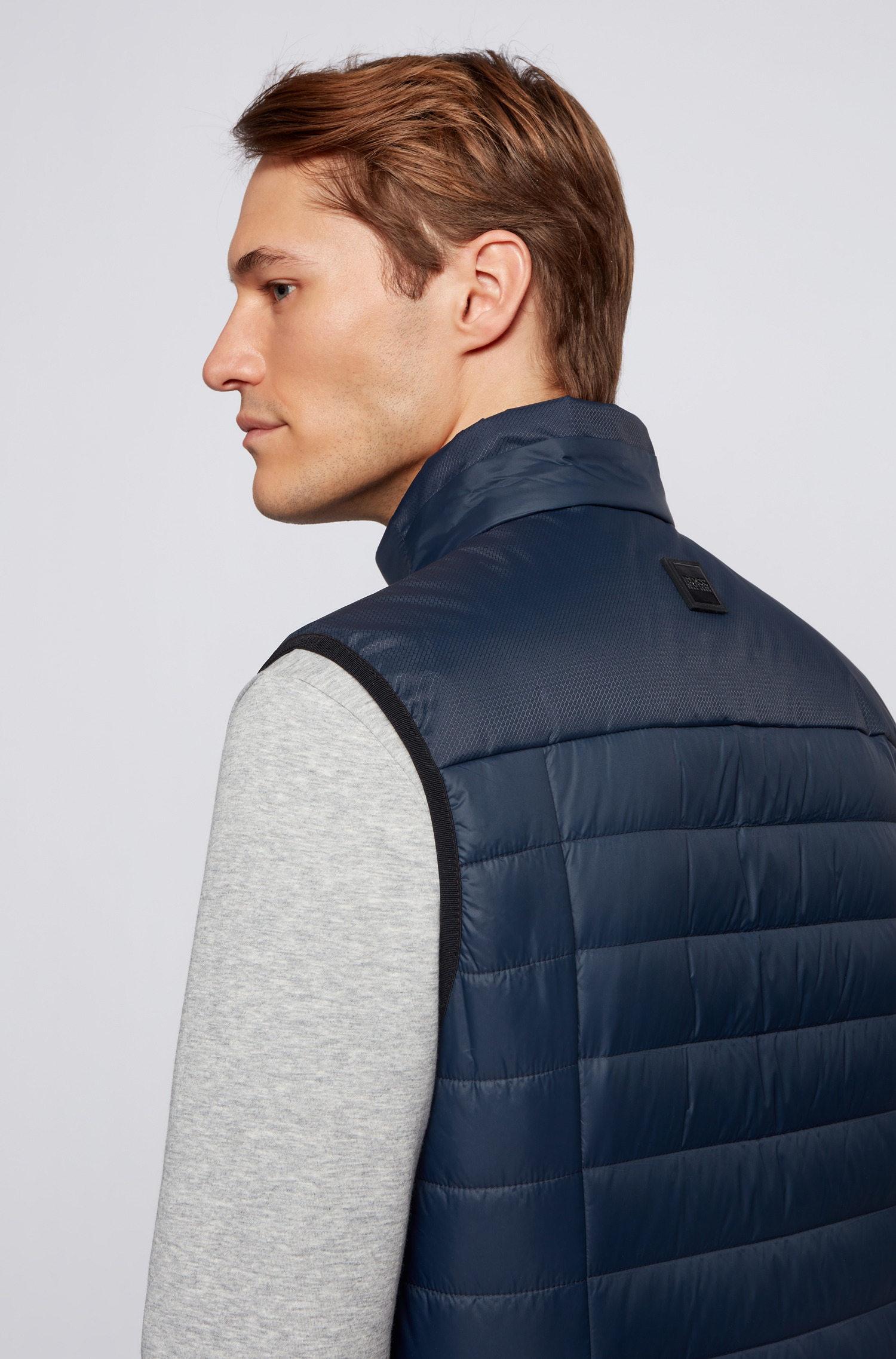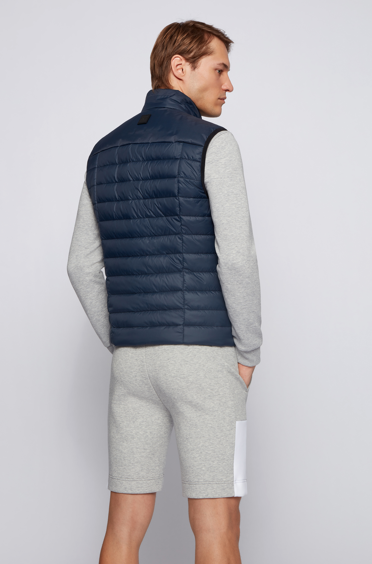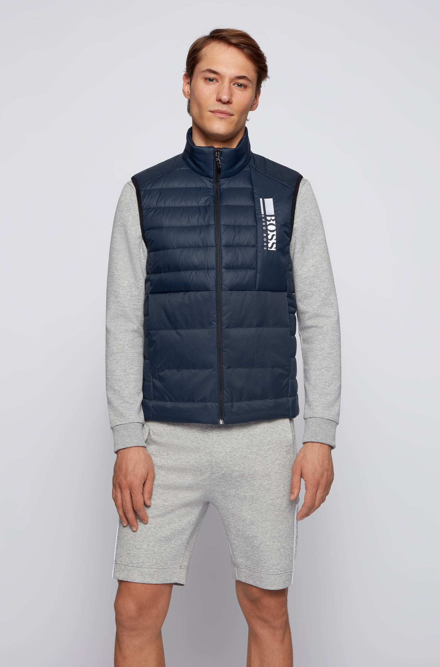 A sporty gilet by BOSS Menswear, constructed in water-repellent fabric with a filling of sustainably sourced down and feather. Cut to a regular fit for easy layering, this baffle-quilted gilet is designed with a colour-block outer featuring a contrast zip and new-season logo artwork printed in a vertical layout. Snap-close pockets provide secure storage for everyday essentials, while a logo badge offers an additional signature signoff at the back.